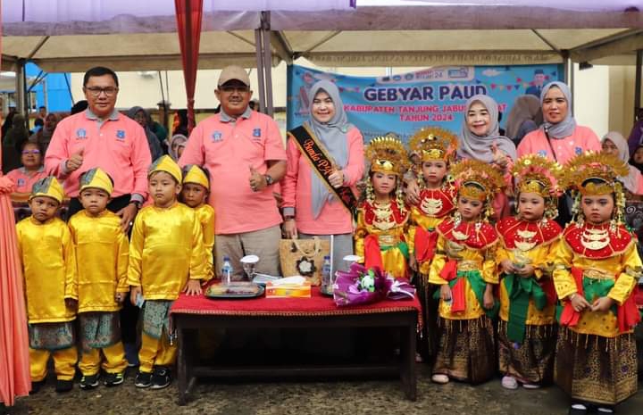 TANJAB BARAT – Bupati Tanjung Jabung Barat, Drs. H. Anwar Sadat, M.Ag, didampingi Bunda Paud, Hj. Fadhilah, menghadiri kegiatan Gebyar Pendidikan Anak Usia Dini (PAUD) dalam rangka memeriahkan Hari Anak Nasional dan Penguatan Gerakan Transisi PAUD ke SD yang Menyenangkan Kabupaten Tanjung Jabung Barat Tahun 2024, Kamis (12/9/2024).