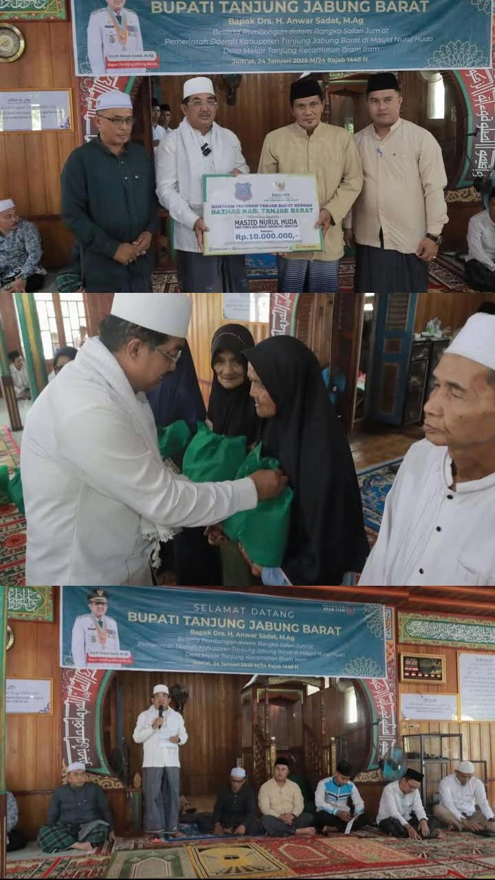 Menutup kegiatan Safari Jumat, Bupati Anwar Sadat menyerahkan bantuan untuk pembangunan Masjid Nurul Huda sebesar Rp 10 juta yang berasal dari dana yang dikelola BAZNAS Tanjab Barat. Selain itu, diberikan juga santunan bagi anak yatim, bantuan untuk takmir masjid, serta paket sembako kepada kaum dhuafa, dan paket kesehatan untuk anak stunting dari Dinas Kesehatan. Tindakan ini merupakan wujud kepedulian Pemkab Tanjab Barat terhadap masyarakat kurang mampu dan menunjukkan komitmen untuk mewujudkan keadilan dan kesejahteraan bagi semua warga Tanjab Barat.