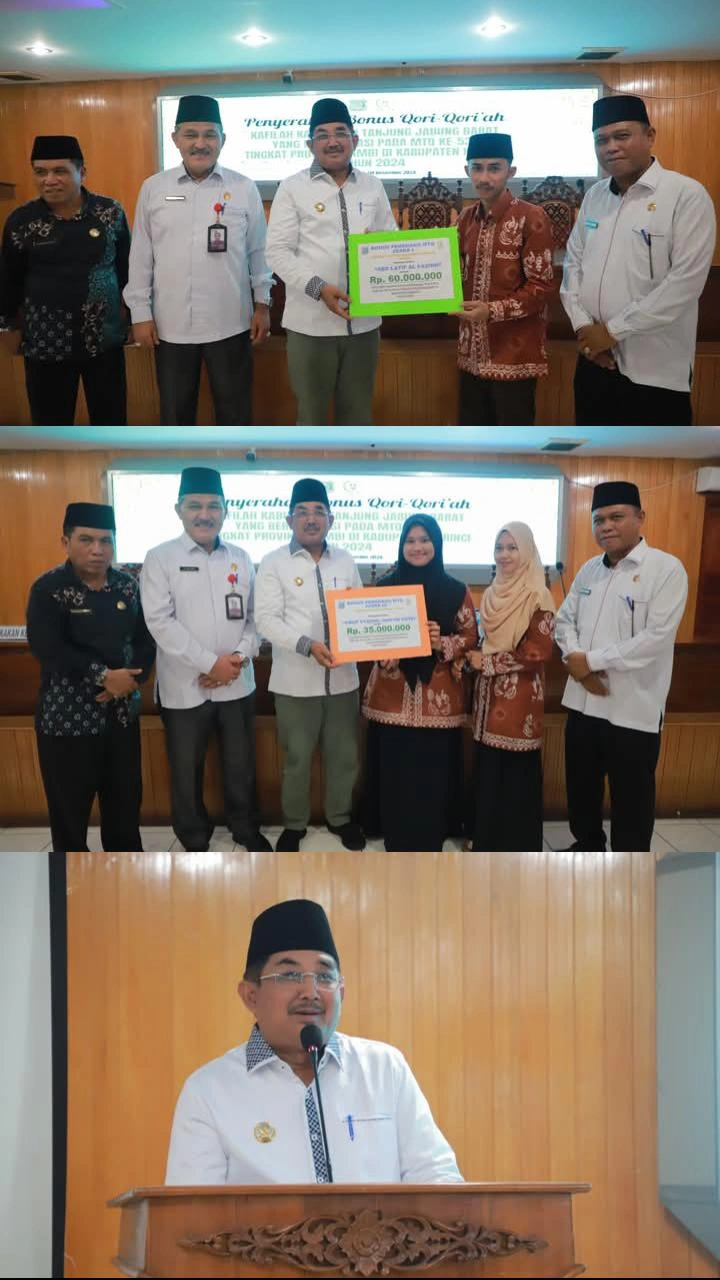 Sebagai bentuk apresiasi, penghargaan, serta rasa syukur, Pemerintah Kabupaten Tanjab Barat memberikan bonus kepada qori dan qoriah terbaik I, II, III, serta Harapan yang penyerahannya dilakukan secara simbolis hari ini.