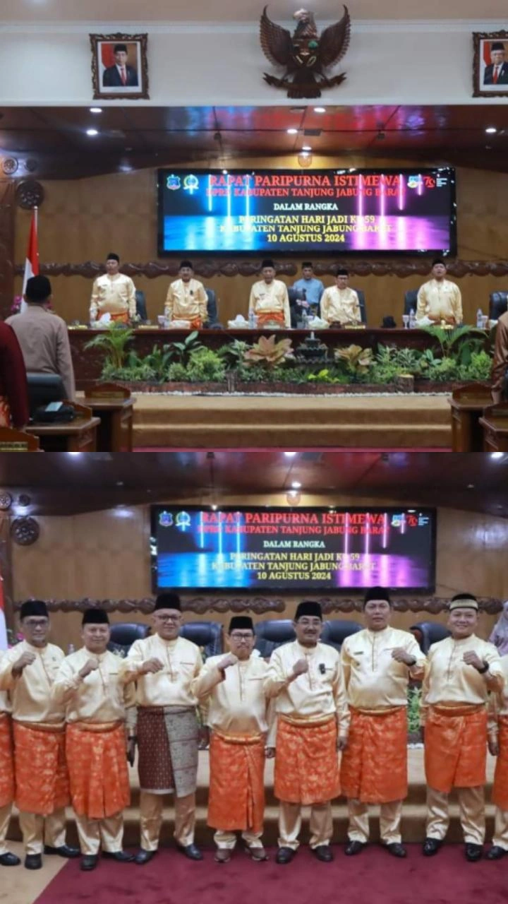 KUALATUNGKAL, – Puncak peringatan Hari Jadi Kabupaten Tanjung Jabung Barat (Tanjabbar), ke-59 ditandai dengan digelarnya Rapat Paripurna Istimewa oleh DPRD Kabupaten Tanjabbar, Sabtu (10/08/2024).