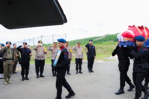 Menyambut Proses Kedatangan jenazah personel Resimen Pelopor Korp Brimob Polri Briptu Anumerta Alfandi Steve Karamoy di Bandara Syukuran Aminuddin Amir Bubung Luwuk(foto Ist)