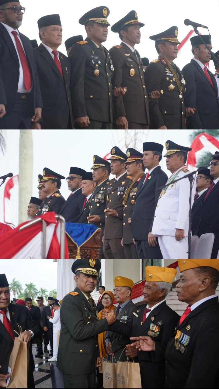 Jambi – Danrem 042/Garuda Putih Brigjen TNI Rachmad S.I.P didampingi Ketua Persit Kartika Chandra Kirana Koorcab Rem 042 PD II/Sriwijaya Ny. Lenni Rachmad, mengikuti Upacara Peringatan Hari Ulang Tahun (HUT) Ke-79 Kemerdekaan Republik Indonesia yang berlangsung khidmat di Lapangan Kantor Gubernur Jambi Jln. Jend. Ahmad Yani, Telanai Pura, Kota Jambi, Sabtu (17/8/2024).