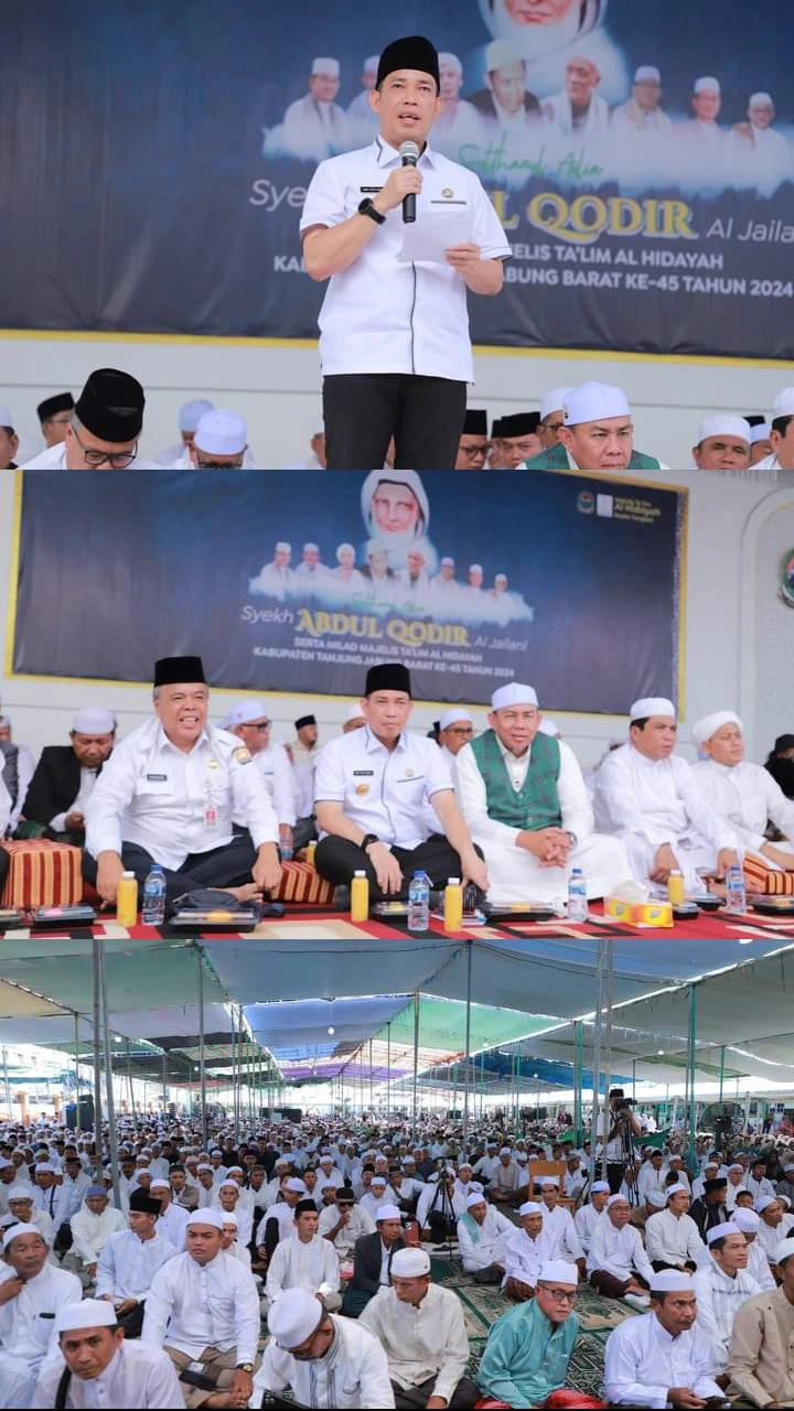Tanjab Barat – Penjabat Sementara (Pjs) Bupati Tanjung Jabung Barat, dr. H. Mhd. Fery Kusnadi, Sp.OG, menghadiri Haul Akbar Sulthanul Aulia Syekh Abdul Qadir Al Jailani sekaligus Milad Majelis Ta’alim Al Hidayah yang ke-45 tahun 2024, Senin (14/10/2024).